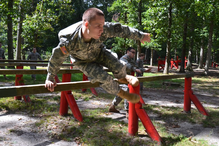 BMB Cadet navigates the Tarzan obstacle high balance beam.