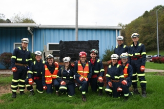 On 4 October 2011, Ben Edwards and Marcus Key took 8 Earth Sciences students to a Patriot Coal mine in Fairview, WV. We began with a safety training session where we learned how to use emergency breathing apparat and were suited up in coveralls, heavy booths, hard hats, eye protection and hearing protection. We went down 100' in an elevator, and headed 4.5 miles back on a train car to the working face. The mine is producing bituminous coal from the 8 ft thick Pittsburgh #8 seam. This the thickest of the Pennsylvanian cylcothem coal deposits in the area. We saw a variety of shale partings and layers of pyritic concretions. We visited the loud and dynamic longwall mining working face. As the longwall mining machine moves through the seam, it drops the roof behind it 8 ft which results in a topographic lowering of 2-3 ft at the surface, 1000 ft above. After a company supplied late luncheon, we headed home with a brief stop at the famous Sideling Hill syncline in western Maryland.
