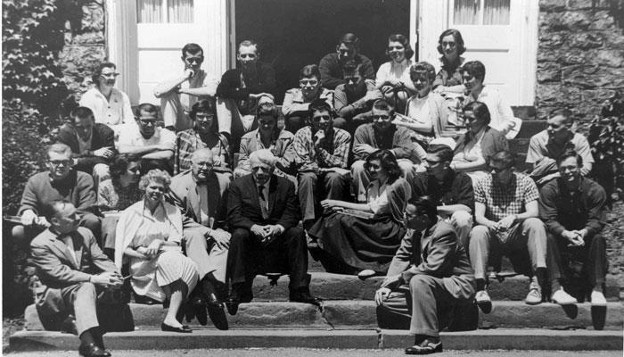 Robert Frost (center) poses on the steps of Old West with Dickinson students in 1959.