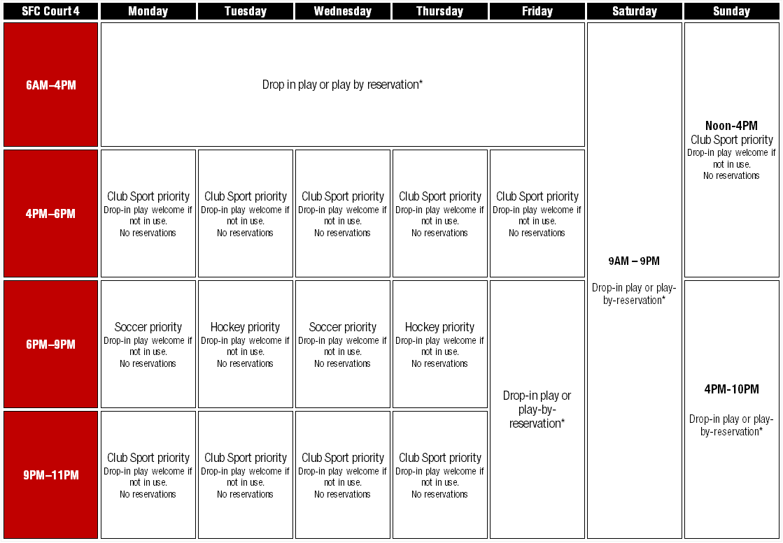 This is a chart from Southern Illinois University with a similar program that allows students to use the facilities. A similar chart for each facility at Dickinson can be made and posted online allowing for the outside community members to know when they can show up. If needed, we can also have the facilities be reserved on an hour to hour basis. If a group/person has a reservation they have first priority.