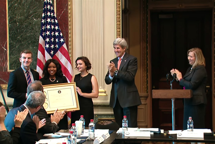 Daniel Becker ’17 receives presidential award from Secretary of State John Kerry.