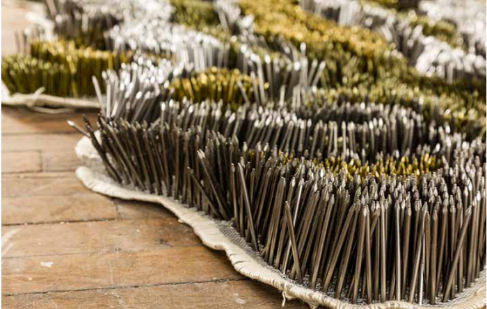Nagelmattan (steel nails, cotton embroidery thread, aluminum screen, and thermal adhesive), detail, by Rowan Price ’18.