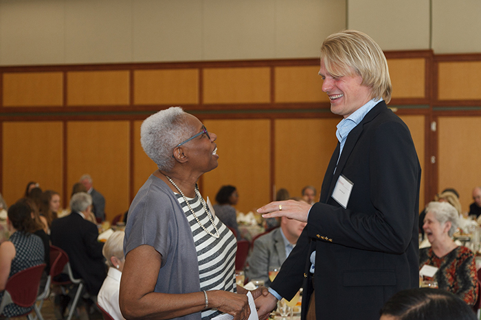Froom greets Dean Joyce Bylander during the 2018 Scholarship Luncheon. Photo by Carl Socolow '77.